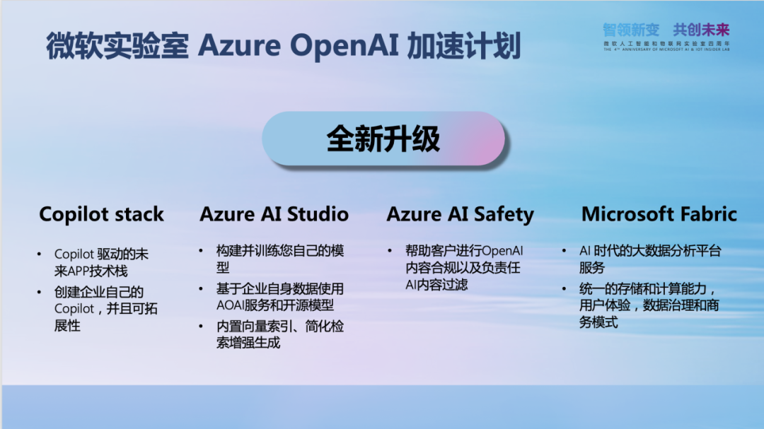 同时借助 Copilot stack 技术栈、Azure AI Studio、Azure AI Safety、Microsoft Fabric 等新产品,微软实验室将不仅助力企业快速构建基于微软 Azure 产品生态矩阵的解决方案,还可以将 Azure OpenAI 能力整合到企业自己的生态系统里,打造自己的企业级 Copilot。