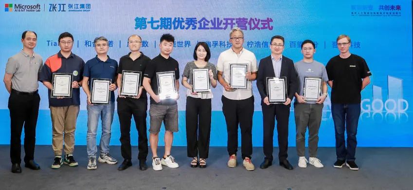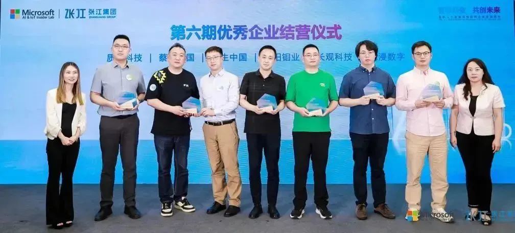 新一代 AI 掀起的技术热潮,正在催生硬核新科技、产业新赛道、未来新场景、治理新议题。微软人工智能和物联网实验室正充当了前沿技术商业化的载体。在四周年活动现场,上海张江科技创业投资有限公司总经理余洪亮与微软人工智能和物联网实验室总经理祝焕婧,共同为6家微软实验室第六期优秀结营企业代表颁发奖杯。微软中国生态伙伴事业部创新技术总经理崔宏禹与微软人工智能和物联网实验室技术负责人 Anton Romanov 为8家第七期开营企业授牌。