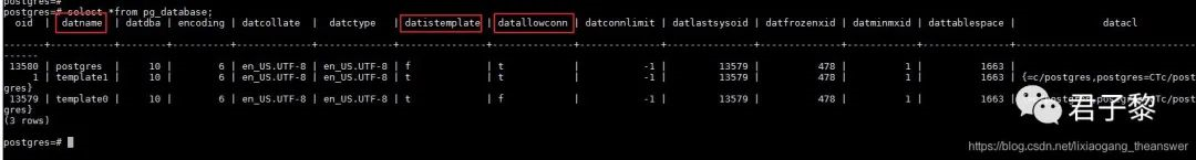 postgres和template1数据库的datallowconn字段为t,而template0数据库f。表明数据库postgres和template1是允许用户(包括psql)连接,而template0不允许连接。