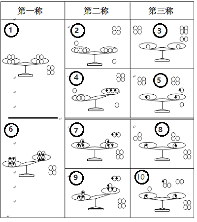 2.如果不平衡,则根据天平的倾斜方向得知次品轻重,在C组(3个乒乓球)中称取一次即可推断。
