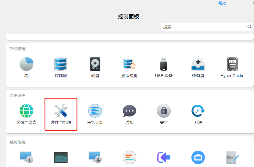 1、我们登录TOS系统,打开【控制面板】,下滑找到【硬件与电源】。