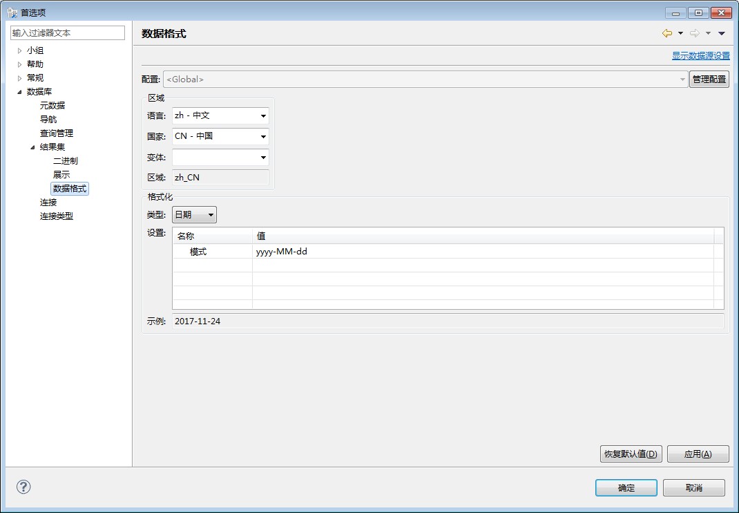 2.进入界面选择“数据库”-->“结果集”-->“数据格式”,格式化类型选择下拉框“时间戳”,值填写为“yyyy-MM-dd HH:mm:ss.SSS”,点击应用按钮确定之后,重新查询即可。