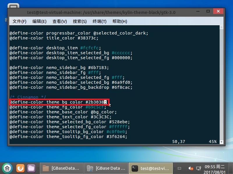 2.修改当前操作系统使用的主题背景颜色,例如当前操作系统使用的主题是黑色主题kylin-theme-black,需要修改/usr/share/themes/kylin-theme-black/gtk-3.0/gtk-main.css 文件中的背景色属性theme_bg_color改为白色#ffffff,如下图所示,修改完成后重启GBaseDataStudio即可。
