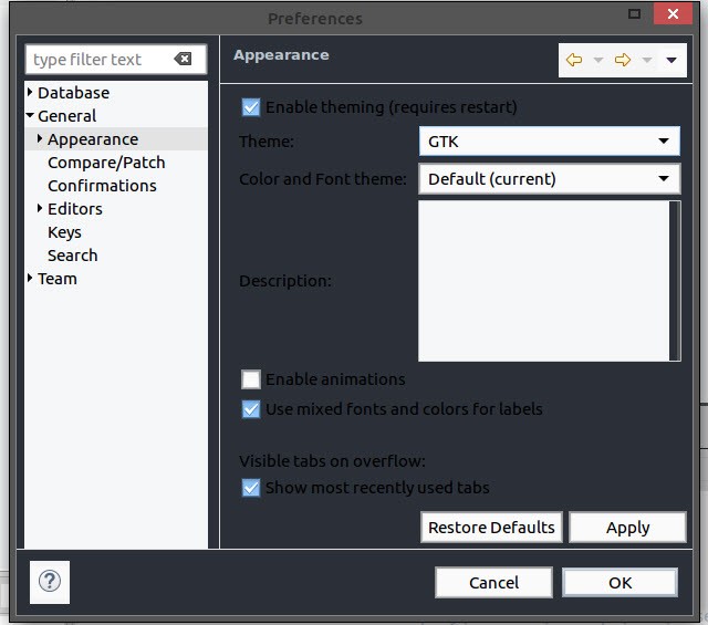 1.选择菜单栏“Window”-->"Preferences",打开设置界面选择左侧树“General”-->"Appearance"。设置“Theme”属性为“GTK”,设置Color and Font theme属性