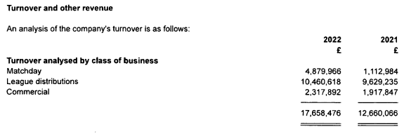 至于比赛日和商业收入的涨幅,我们来参考一下上赛季首次升入英超的布伦特福德:在升入英超之前,排除掉受疫情影响的20/21赛季,布伦特福德每赛季的比赛日收入和商业收入都在325万英镑左右。升入英超之后,这个数字分别涨至1498万和1042万,粗略可以算作翻了四倍。
