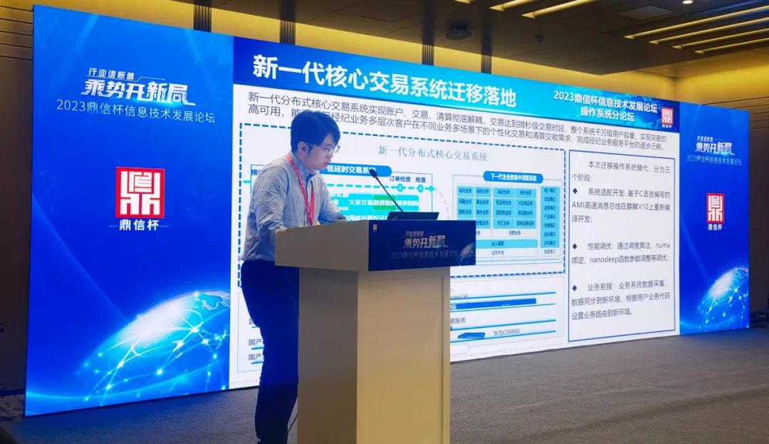 来自国泰君安证券的云平台工程师王家阳在主题分享中表示,国泰君安证券完成了新一代低延时分布式证券交易系统软件上线切换工作,成功适配服务器、操作系统、数据库及中间件。基于银河麒麟操作系统V10的新一代信创分布式核心交易系统实现账户、交易、清算解耦,交易达到微秒级交易时延,整个系统千万级用户容量,实现完备的高可用,能够满足经纪业务多层次客户在不同业务多场景下的个性化交易和清算交收需求,完成经纪业务服务平台的逐步迁移。本次实践有助提升行业对科技的重视程度和自主水平,减少未来被国外技术封锁的风险,保障金融市场的安全。