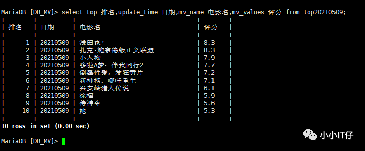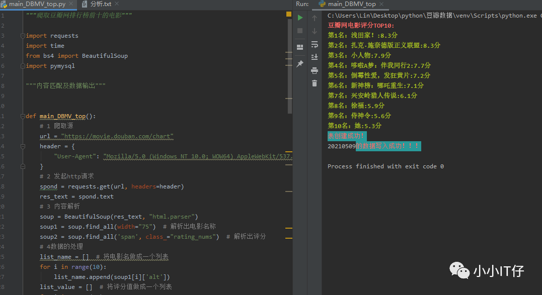 """爬取豆瓣网排行榜前十的电影"""import requestsimport timefrom bs4 import BeautifulSoupimport pymysql"""内容匹配及数据输出"""def main_DBMV_top():# 1 爬取源url = "https://movie.douban.com/chart"header = {"User-Agent": "Mozilla/5.0 (Windows NT 10.0; WOW64) AppleWebKit/537.36 (KHTML, like Gecko) Chrome/90.0.4430.93 Safari/537.36"}# 2 发起http请求spond = requests.get(url, headers=header)res_text = spond.text# 3 内容解析soup = BeautifulSoup(res_text, "html.parser")soup1 = soup.find_all(width="75") # 解析出电影名称soup2 = soup.find_all('span', class_="rating_nums") # 解析出评分# 4数据的处理list_name = [] # 将电影名做成一个列表for i in range(10):list_name.append(soup1[i]['alt'])list_value = [] # 将评分值做成一个列表for i in range(10):list_value.append(soup2[i].text)dict_name_value = dict(zip(list_name, list_value)) # 将两个list转化为字典dictmv_top = sorted(dict_name_value.items(), key=lambda kv: (kv[1], kv[0]), reverse=True) # 字典从大到小排序,type==list'''数据-->mysql---创建每日表'''conn = pymysql.connect(host='192.168.174.130',user='mv',password='mv',database='DB_MV');'''游标的使用----创建表,表名为top+当天日期'''cursor1 = conn.cursor() # 获取游标sql1 = 'create table if not exists top' + str(update_time) + '(TOP int not null primary key AUTO_INCREMENT,update_time varchar(11),mv_name varchar(11),mv_values varchar(11)); 'cursor1.execute(sql1) # 执行语句conn.commit()cursor1.close() # 释放游标conn.close()'''写入数据'''print("\033[1;31m豆瓣网电影评分TOP10:\033[0m")for i in range(len(mv_top)):mv_top_name = mv_top[i][0] # 取出电影名,后期直接使用mv_top_value = mv_top[i][1] # 取出评分,后期直接使用print("\033[1;32m第" + str(i + 1) + '名:' + str(mv_top_name) + ":" + str(mv_top_value) + "分\033[0m")conn2 = pymysql.connect(host='192.168.174.130',user='mv',password='mv',database='DB_MV');'''游标的使用----导入数据,第一列为自增列代表排名'''cursor2 = conn2.cursor() # 获取游标sql2 = 'insert into top' + str(update_time) + ' (update_time,mv_name,mv_values) values (%s,%s,%s);'cursor2.execute(sql2, [update_time, mv_top_name, mv_top_value]) # 执行语句conn2.commit()cursor2.close() # 释放游标conn2.close()if __name__ == '__main__':update_time = time.strftime("%Y%m%d", time.localtime()) # 获取当天日期main_DBMV_top() # 调用函数,抓取数据,传教mysql表,将数据写入nysqlprint('\033[0;31;46m表创建成功!\033[0m')print(update_time+"\033[0;31;46m的数据写入成功!!!\033[0m")