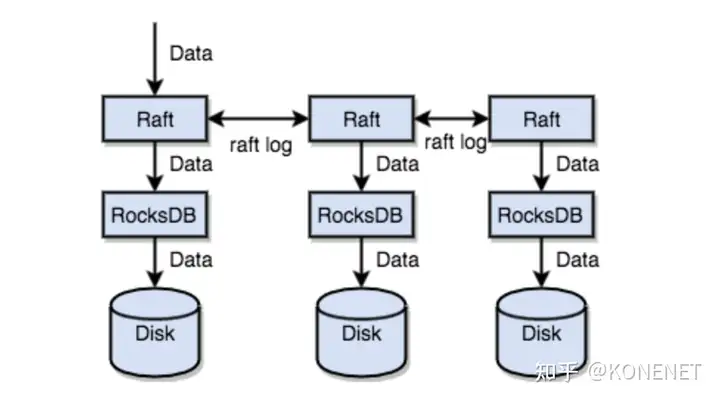 TiKV 利用 Raft 来做数据复制,每个数据变更都会落地为一条 Raft 日志,通过 Raft 的日志复制功能,将数据安全可靠地同步到复制组的每一个节点中。不过在实际写入中,根据 Raft 的协议,只需要同步复制到多数节点,即可安全地认为数据写入成功。