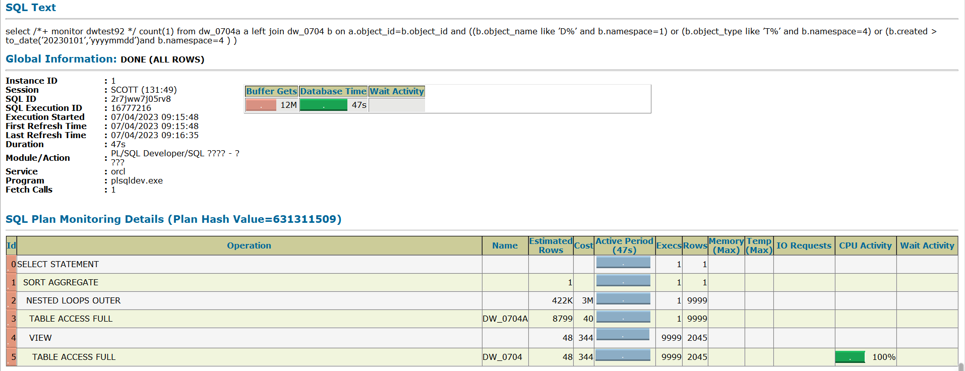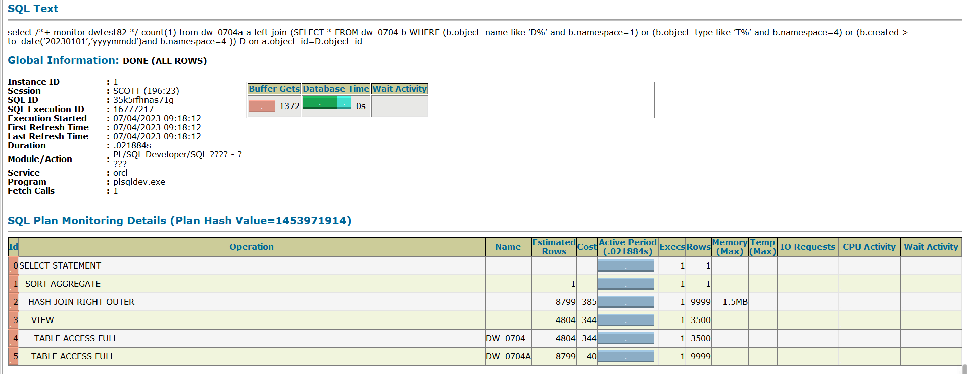 on a.object_id = D.object_id比较下两次执行的效果以及执行计划,我们采用sql monitor收集真实的执行计划,用hint强制采集,/*+ monitor dwtest92 */