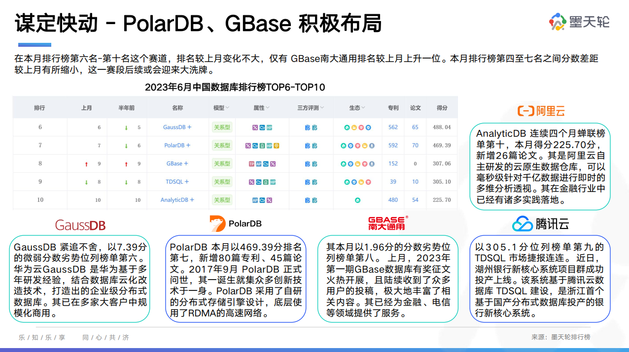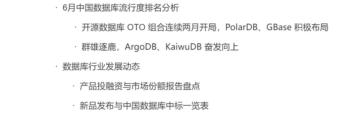 墨天轮6月《中国数据库行业分析报告》已正式发布(点击即可跳转,欢迎大家下载查阅),本期报盘点了墨天轮“中国数据库流行度排行”、产品投融资及市场份额报告等业内资讯,并整理了2023年上半年中国数据库中标一览表,以此展现当前数据库市场发展前沿动态。