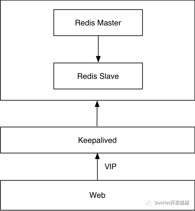此方案没有使用到 Redis Sentinel。此方案使用了原生的主从和 Keepalived,VIP 切换通过 Keepalived 保障,Redis 主从之间的切换需要自定义脚本实现。