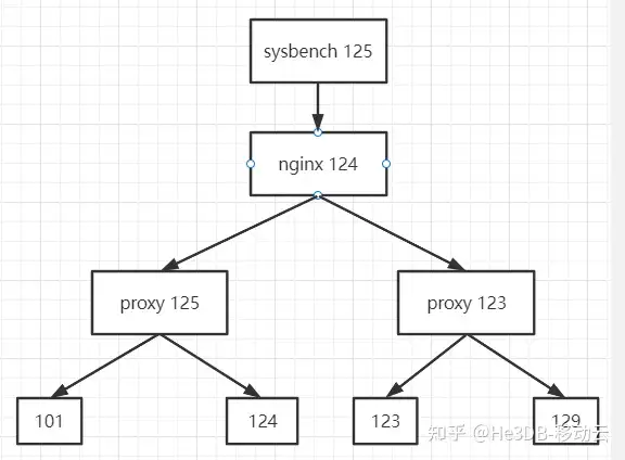 高可用下进一步测试:将集群调整为1主三从四台机器,部署两个proxy,每个proxy转发至两个读节点,同时通过nginx转发两个中间件,拓扑如下: