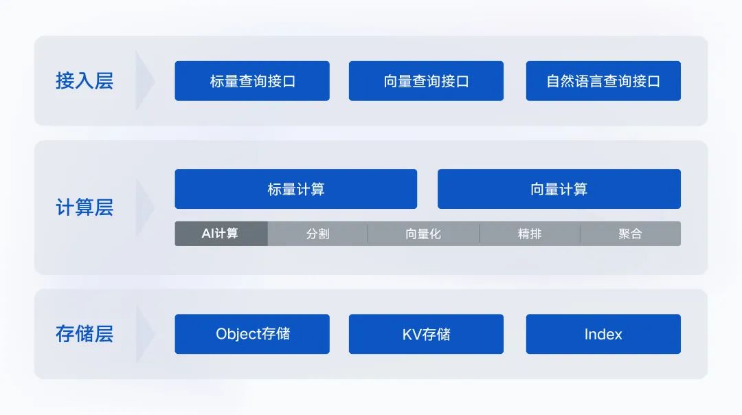 在接入层,智能化支持自然语言文本的直接检索; 在计算层,通过AI算子替代企业寻找/调优AI算法,将接入工期从一个月缩短到3天; 在存储层,融合智能压缩算法,把向量存储成本降低50%。