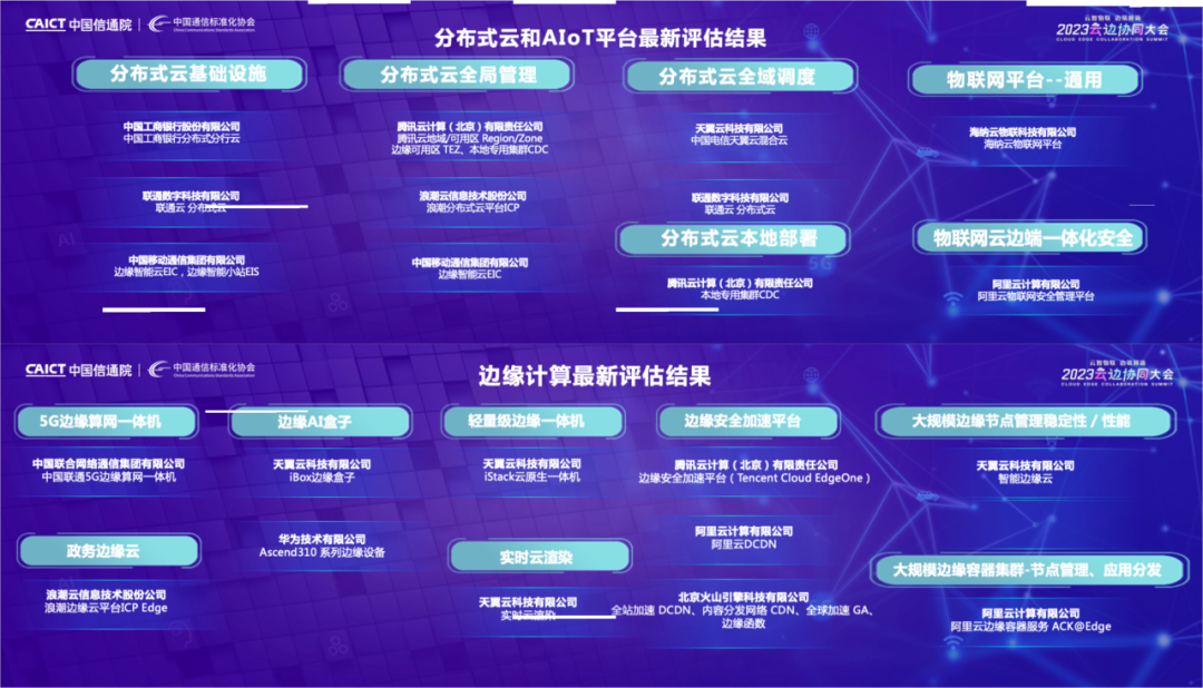 在成果发布环节,大会发布2023年分布式云、边缘计算、AIoT平台等最新评估结果,共有来自11家企业的22个产品及平台通过了本次评估。
