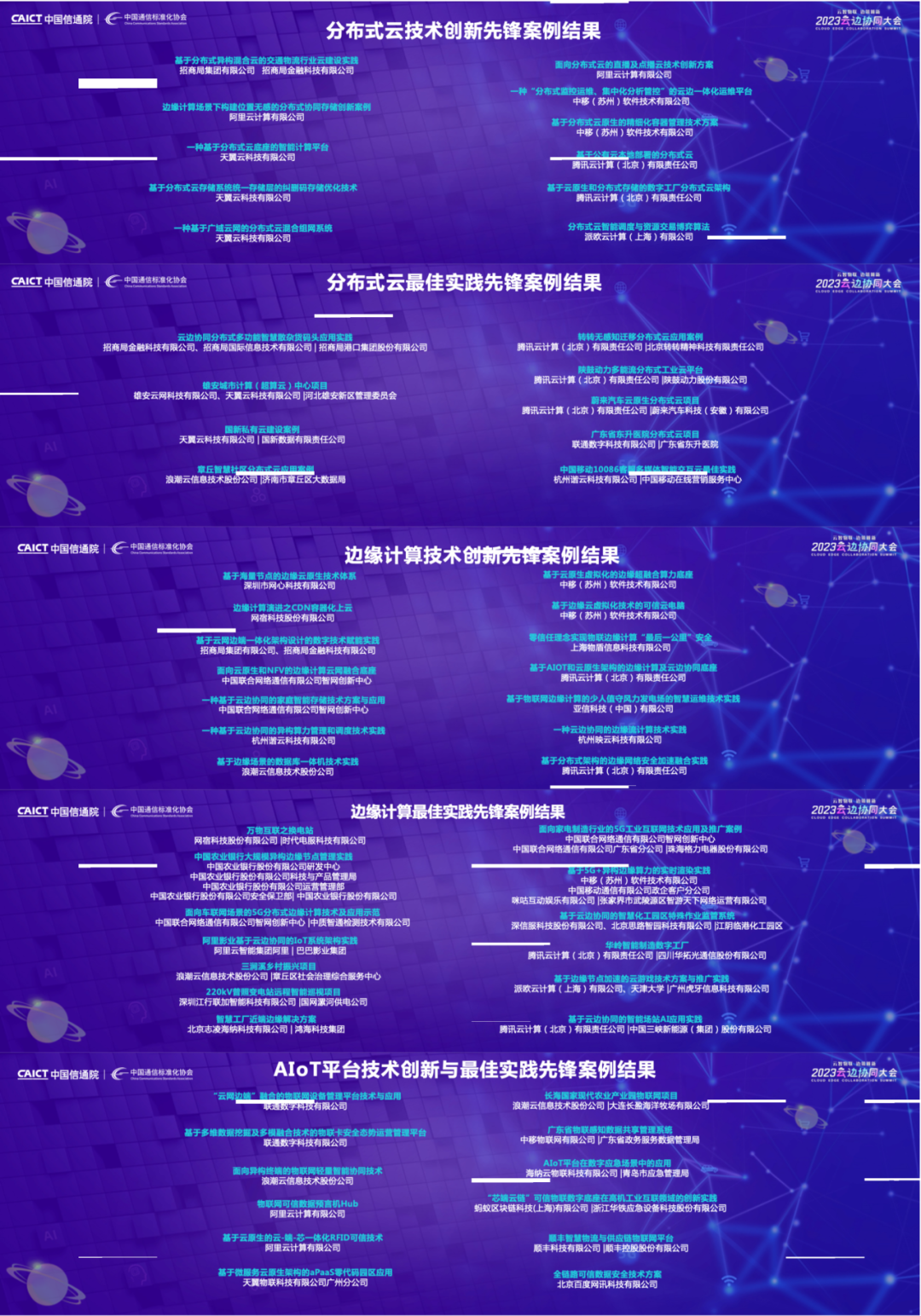 大会发布了2023云边端一体化技术创新与最佳实践先锋案例,分布式云、边缘计算与AIoT平台,分别有20个、27个和12个案例获评技术创新与最佳实践先锋案例,为推广相关技术的先进经验与最佳实践树立了行业标杆。