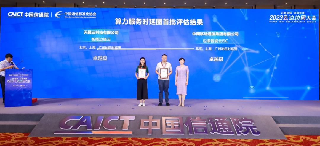 在算力服务时延圈专题行动环节的最后阶段,栗蔚为通过算力服务时延圈评估的单位颁发证书,在本次评估中,天翼云科技有限公司的智能边缘云、中国移动通信集团有限公司的边缘智能云EIC在北上广地区时延圈评估中都达到了卓越级水平。