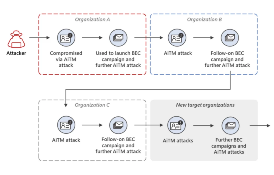 这是微软安全团队最新发现的一个针对银行和金融服务机构的多攻击阶段的、基于中间人攻击技术(AiTM)的网络钓鱼和商业邮件欺诈(BEC)的、绕过多因素身份验证(MFA)的 APT 攻击案例,非常精巧和厉害,目前我们也发现更多的 APT 攻击组织在使用类似的技术来攻击其他的企业组织。这次 APT 攻击起源于一个供应商遭遇钓鱼邮件攻击,并随之演变成针对多个企业组织的、后续一系列的中间人攻击和商业邮件欺诈攻击活动,在整个攻击过程中,攻击者使用了印尼、伊朗和美国等不同地区的资源来进行复杂的攻击行为。同时在这个案例中充分的显示了基于中间人攻击技术(AiTM)的网络钓鱼和商业邮件欺诈(BEC)的复杂性,它们滥用供应商、供货商和其他合作伙伴组织之间的信任关系,目的是进行金融欺诈。整个安全事件的完整攻击流程如下图所示: