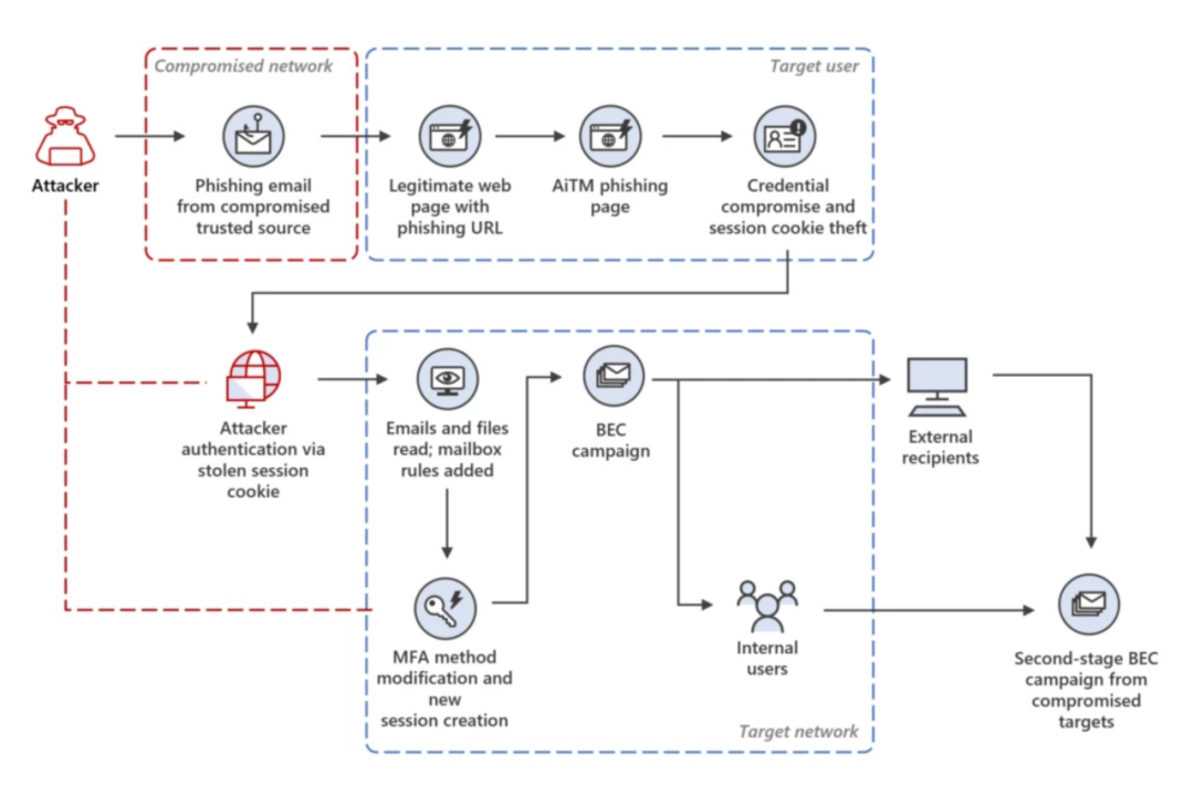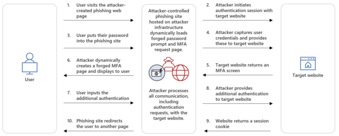 中间人攻击技术(AiTM)是一种旨在拦截用户和正常服务之间的认证的攻击,目的是窃取、篡改身份或执行其他行动。攻击者将自己置于用户和服务之间,窃取用户凭证并拦截后续的多因素身份验证(MFA)信息,以捕获用户通过身份验证的会话 Cookie。然后,攻击者可以在会话 Cookie 到期前利用窃取的用户会话 Cookie 重放会话并伪冒用户身份,攻击者从而可以访问受害用户允许访问的资源和应用程序,并进行后续的商业邮件欺诈(BEC)攻击和其他恶意活动。