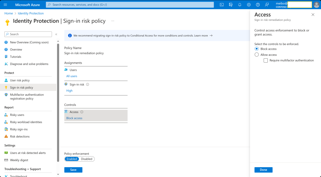 【2】通过 Azure AD Identity Protection 实现基于用户登录风险和用户身份风险的访问控制,例如直接拒绝风险为高的用户登录(如下图所示);
