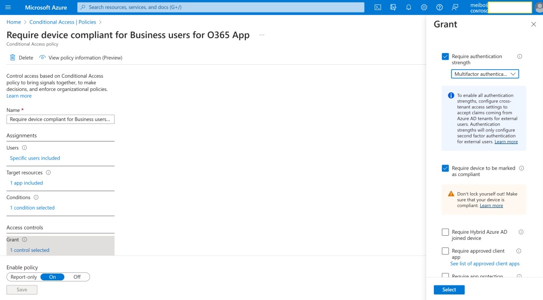 【3】通过 Azure AD 基于条件的访问控制策略,对于特定用户、特定场景或特定风险登录,要求使用特定的 MFA 验证强度和方式,或者要求仅允许通过注册合规的设备登录(如下图所示);