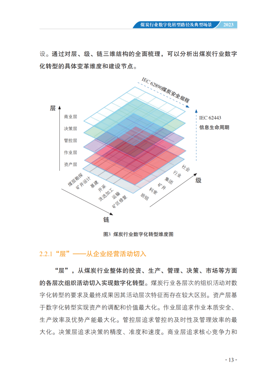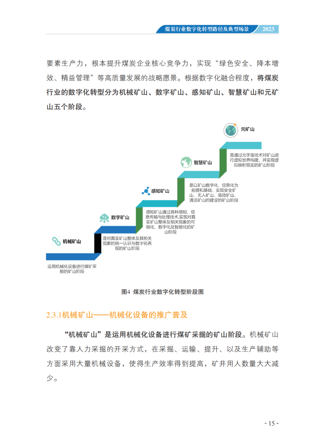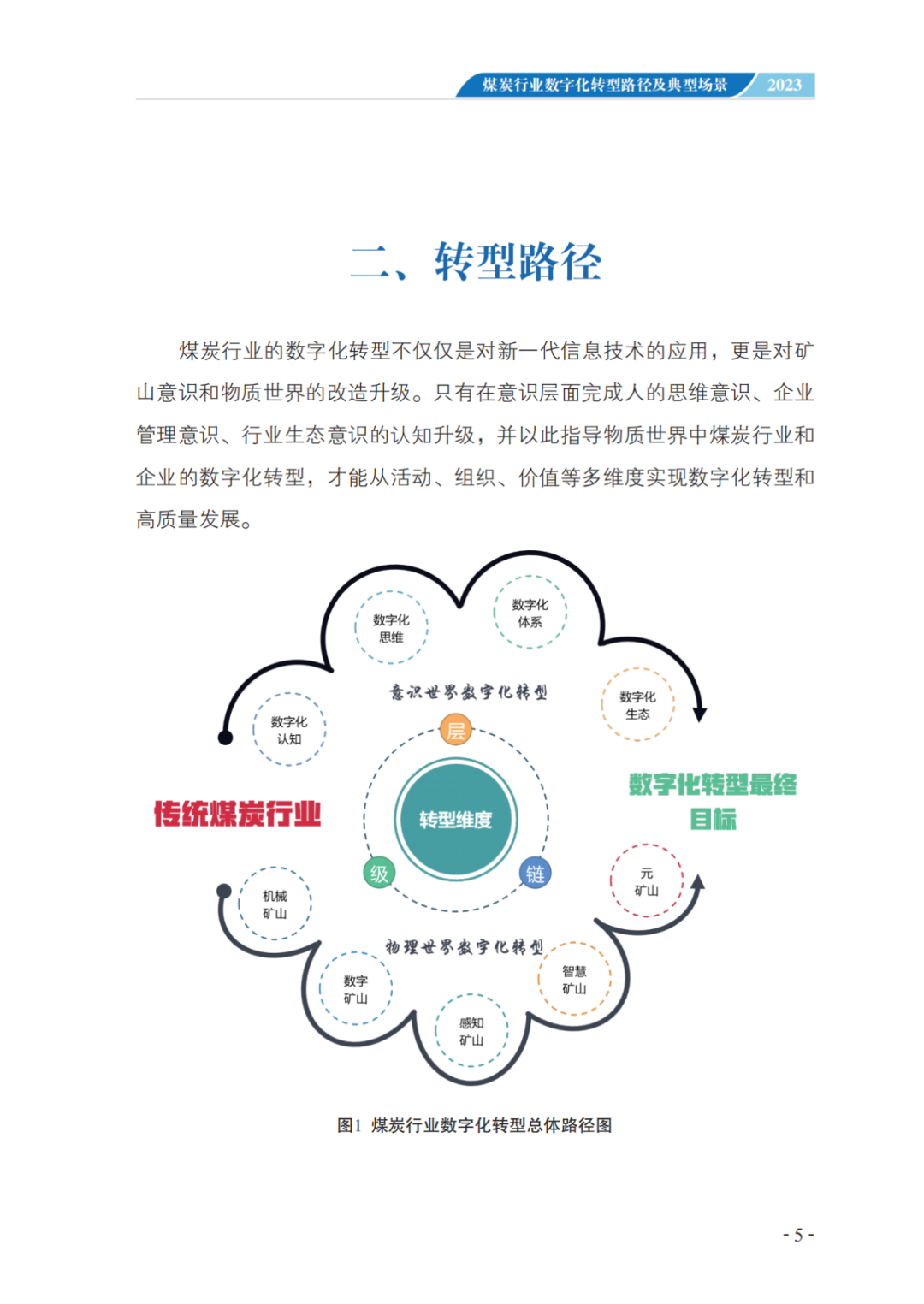 作为数字经济与实体经济融合发展的关键支撑,数字产业化和产业数字化成为当前产业转型升级的核心驱动。《“十四五”信息化和工业化深度融合发展规划》提出,要制定重点行业领域数字化转型路线图、构建制造企业数字化转型能力体系。在绿色创新、科技兴工的新时代,煤炭行业面临着转型升级、探索可持续发展之路的重大挑战与机遇,数字化转型迫在眉睫。根据各地2022年政府工作报告显示,煤炭企业的生产、管理和安全仍然是数字化转型的重要基础目标。此外,“碳达峰”“碳中和”目标的提出,绿色转型成为了煤炭企业数字化转型的新目标之一。并且,随着煤炭消费达峰和煤炭行业减量发展成为必然趋势,如何保持煤炭行业自身健康发展和做好能源“兜底”保供问题事关重大,实现煤炭行业柔性调控,避免“一刀切”式的“去煤化”和煤炭“双控”成为了煤炭行业数字化转型又一重要目标。为加速推进煤炭行业的数字化转型,中国电子技术标准化研究院在前期研究基础上,牵头编制形成《煤炭行业数字化转型路径及典型场景(2023)》,系统分析煤炭行业数字化转型的技术、政策、产业、应用现状,梳理煤炭行业数字化转型标准化需求,科学绘制煤炭行业数字化转型路线图,为有重点、有层次地推动煤炭行业数字化转型提供指导,并在此基础上,提出未来展望,以期为社会各界提供参考。