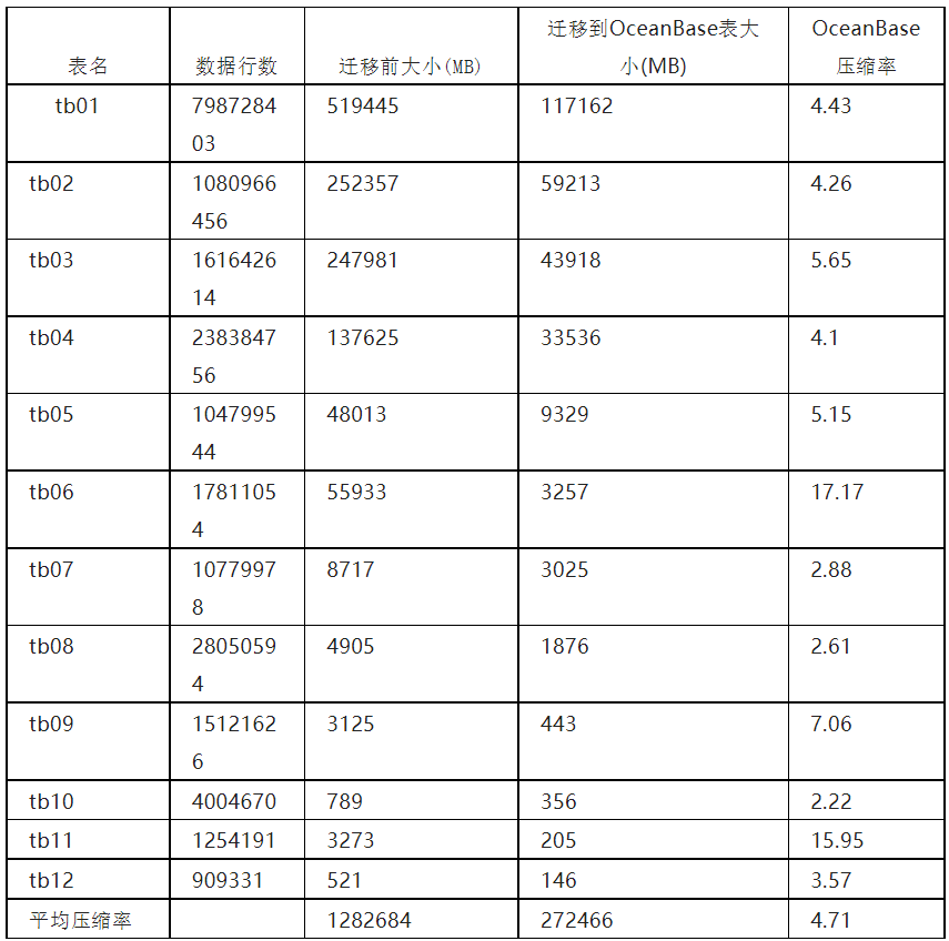 基于上述三个痛点,相较于 MySQL,OceanBase 的优势更加显著。首先,针对数据量大的痛点,通过之前我们在生产环境做的一些数据迁移测试,OceanBase 可以把业务数据压缩至 MySQL 的 1/5 甚至 1/4,在相同规格的机器上,这样的数据压缩率可以支持我们存放期限更长的监控数据,一些线上数据迁移到 OceanBase 后的大小和压缩率如下表所示。