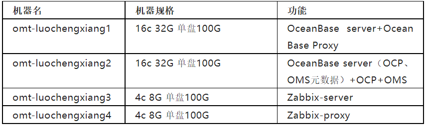 可以看到对于不同的表,OceanBase 的数据压缩率也不同,综合来看,平均压缩率是 4.71。其次,针对数据读写瓶颈这个痛点,由于 OceanBase 是基于 LSM-Tree 的分布式数据库,因此,在数据写入方面有天然优势。根据生产环境规格的机器 sysbench 写入性能测试的结果,OceanBase 的综合写入性能是 MySQL 的 3 倍以上。最后,针对痛点三的分区表不易维护,我们也对 OceanBase 进行了测试。OceanBase 的 Online DDL 特性使它对分区表的维护非常平滑,不需要特定维护窗口停监控系统去做分区表的维护。truncate 表分区都是秒删,数据清理非常方便。相比之下,MySQL 在清除分区的时候,不仅会锁表,还会造成大量的磁盘I/O。此外,我们在监控系统中选择使用 OceanBase,也是为核心业务上线 OceanBase 积累经验。我们计划先使用 4 台虚拟机进行兼容性测试和基础功能验证,机器规划如下:* 由于是本人申请的,所以机器名以申请人本人名字命名 -_-!