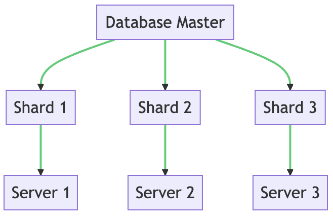上面的图表展示了一个分片数据库的可视化表示。主数据库被分割成更小的分片,每个分片都存储在不同的服务器上。