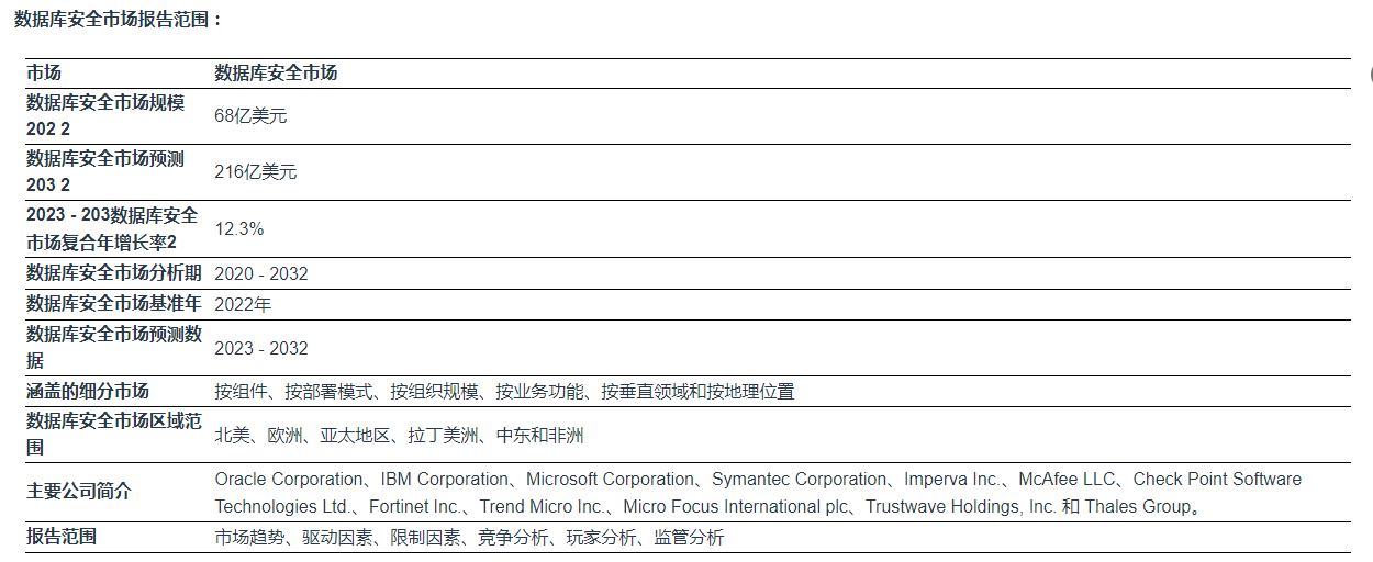 文章来源:https://www.globenewswire.com/news-release/2023/07/06/2699997/0/en/Database-Security-Market-Size-Predictions-suggest-a-rise-of-12-3-CAGR-to-reach-value-of-USD-21-6-Billion-by-2032.html