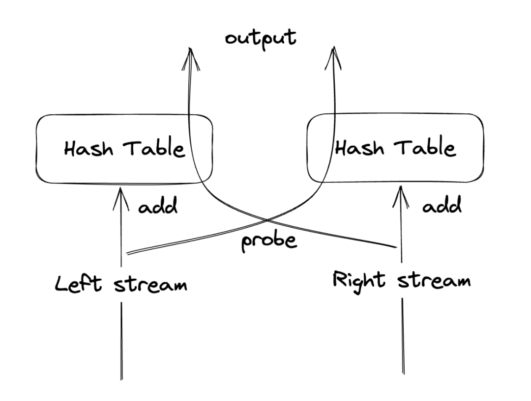 业界通用的流处理Join使用的算法基本上都是Symmetric Hash Join[2](需要有等值连接条件),它的思想很简单,主要是为Join的两边输入各自维护一个Hash表(Hash key为Join key)。每当一边有输入过来时,先插入自己的Hash表,再去查一下另外一边的Hash表并计算出Join的输出结果。不难看出这里的两边输入是对等(Symmetric)的关系。其中的Hash表也称为Join的状态(State)。