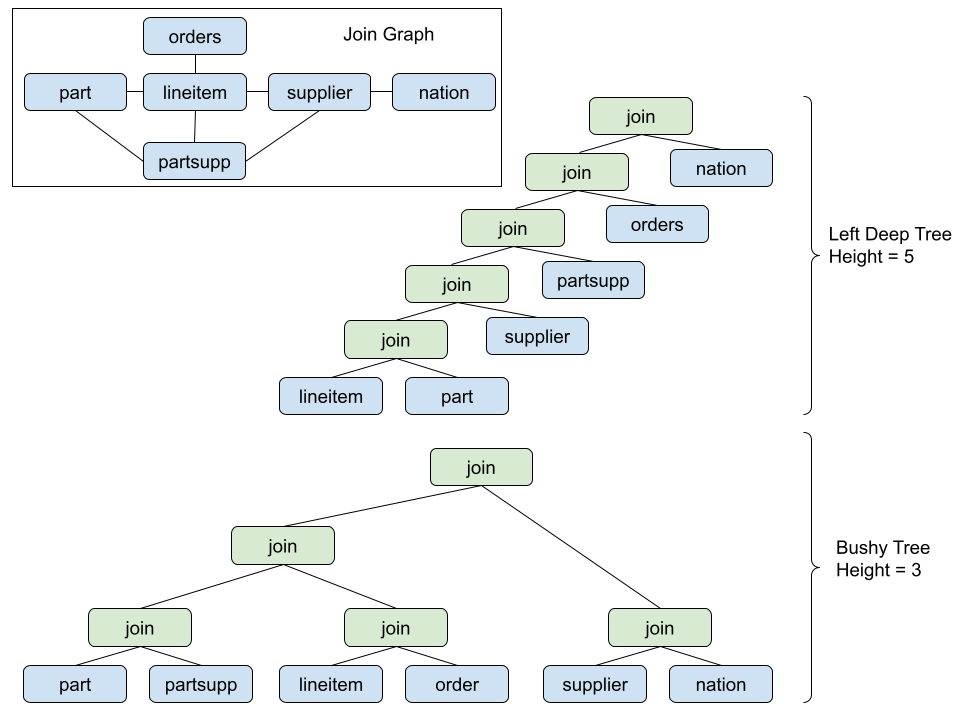 下图为TPCH Q9的Join Graph及Left Deep Tree和Bushy Tree的比较: