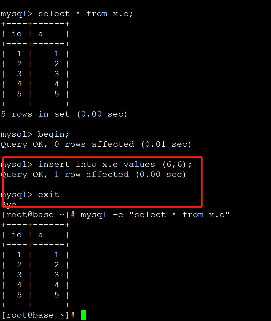 然而,在写入一条数据以后。执行了一个退出。即事务没有完成。那么这条数据在使用者角度中认为这是没提交。最终没有查到id为6的数据,符合预期。