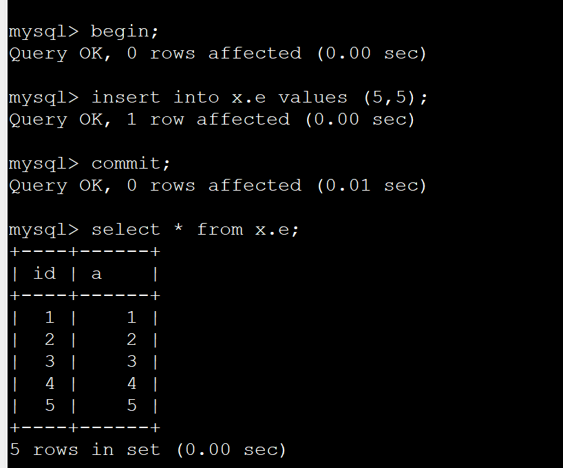 在开始事务以后,写入一条数据。并且提交了。那么就有5条数据。这和预期一样。