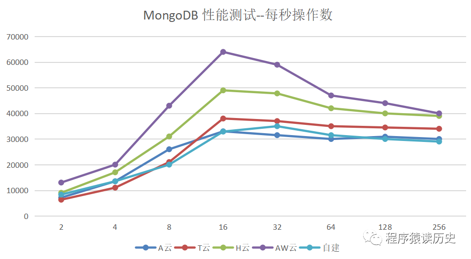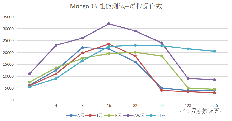 每秒操作数一开始随着线程数的增加而增大,到达一定线程数后,每秒线程数下降。最大值均出现在16个线程时。 当线程数到达16时,各家云厂商的产品CPU负载均到达了95%以上。 当线程数到达32时,平均RT是负载较低时的10倍左右。 50%写50%读场景,数据库每秒操作数降低了2倍左右,RT也增长了2倍左右。 自建的MongoDB在性能上,和同规格的阿里云、腾讯云并没有太大差异,性能基本相同。