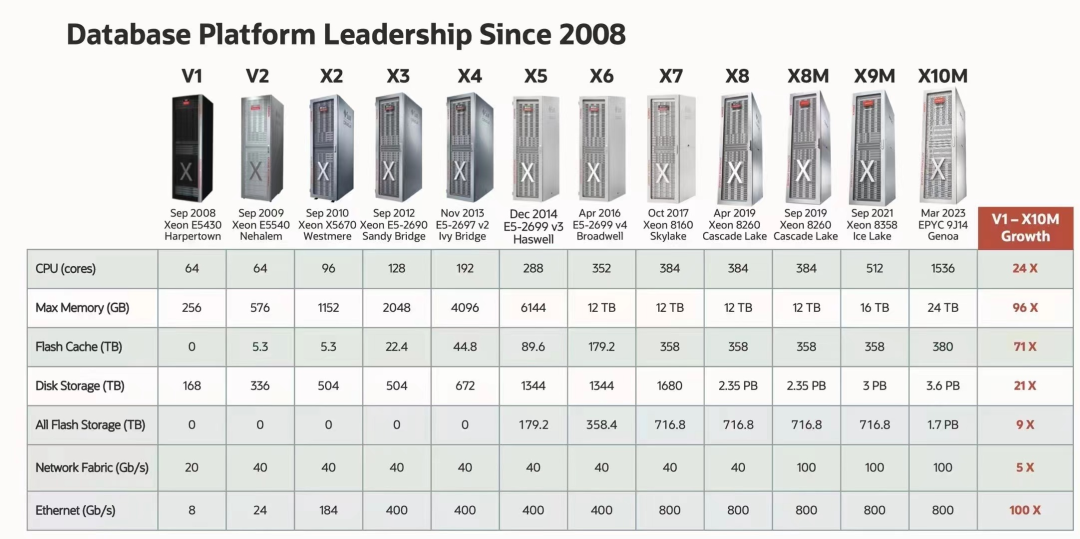 Oracle于6月22日正式公布Exadata X10M系列,下图为各版本硬件配置。
