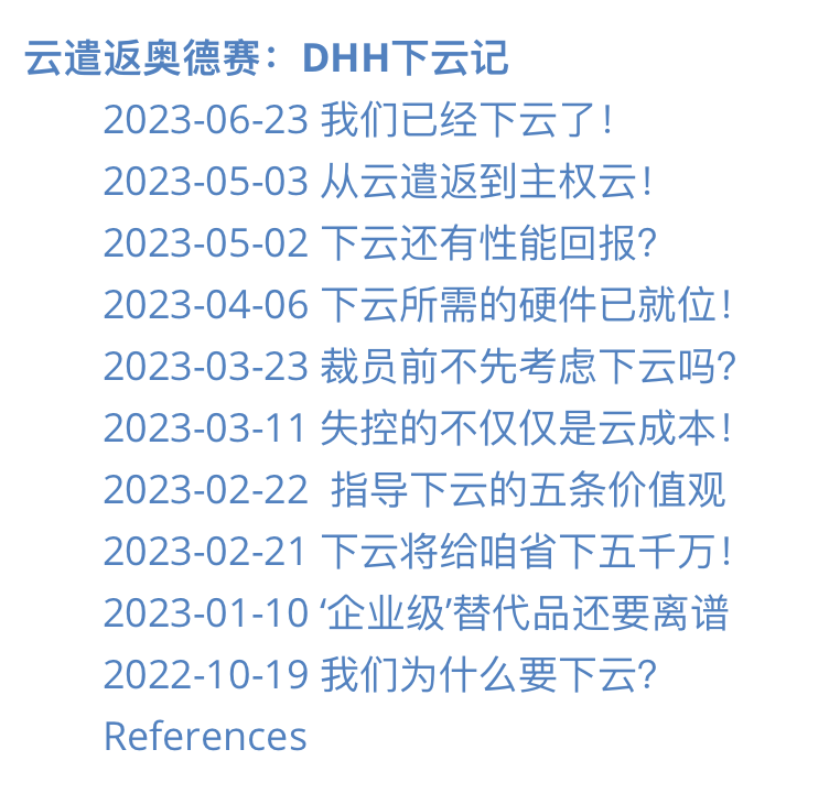 推荐语:DHH一直以来都是下云先锋,本文摘取了DHH博客关于下云相关的十篇文章,记录了 37Signal 从云上搬下来的完整旅程,按照时间倒序排列组织,译为中文,以飨读者。