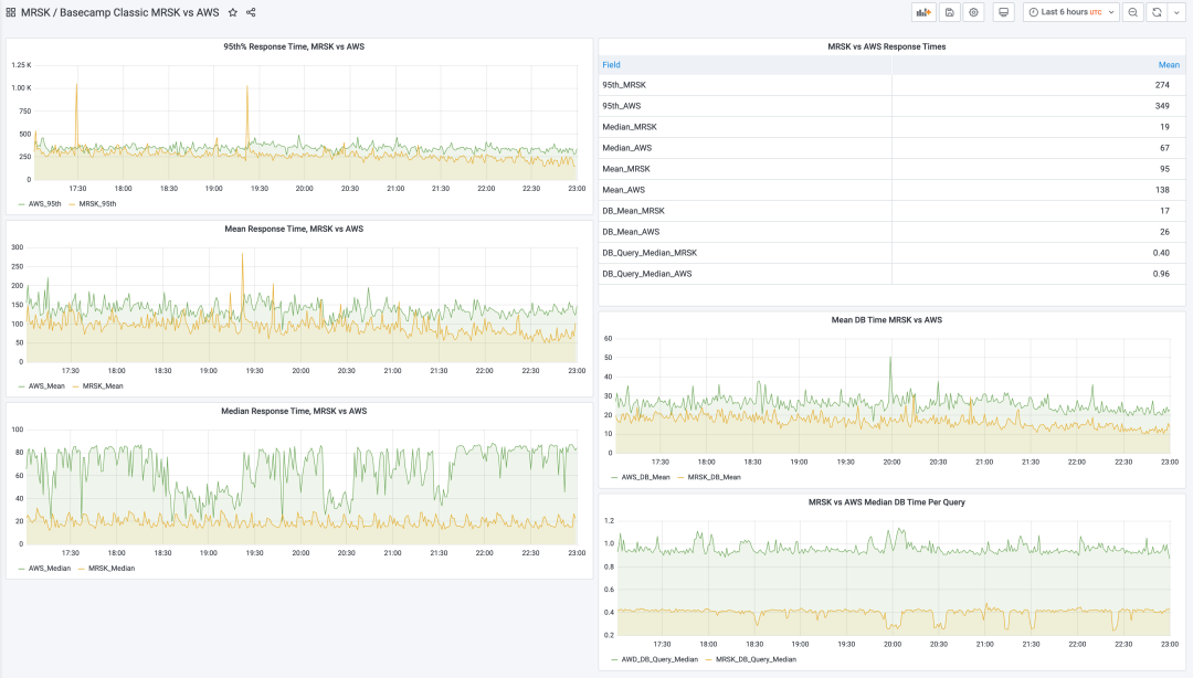 上周,我们成功完成了迄今为止最大的一次下云行动,这次是搬迁 Basecamp Classic。这是我们从2004年开始就整起来的元老应用。而现在,在AWS上运行了几年之后,它又回到了我们自己的硬件上使用 MRSK 管理,天哪,性能实在是太屌了,看看这张监控图: