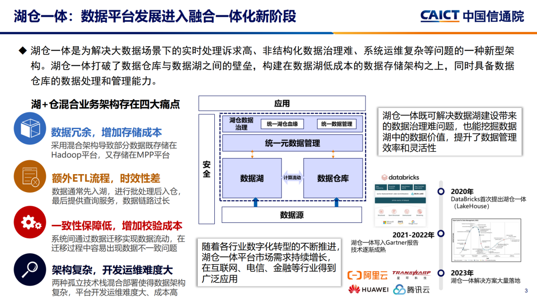 大家好,我是中国信息通信研究院云计算与大数据研究所何宝宏,今天很荣幸,由我来为大家发布2023大数据十大关键词。大数据十大关键词是基于信通院长期对产业的研究与观察,充分结合了行业一线专家的观点,希望能够预示大数据产业当前发展的热点方向。数据从计算机语言到成为生产要素的全生命周期包括以下七个环节,数据资源化、数据治理、数据资产化、数据开发应用、数据流通、数据要素市场建设、数据安全。今年的十大关键词中有四项分布于数据开发应用环节,两项分布于数据要素市场环节,两项分布于数据安全环节,体现出了今年发展的重点在于数据的业务赋能与内外部融通,以及继续夯实安全基础。下面我将按顺序一一介绍。关键词一:湖仓一体,数据平台发展进入融合一体化新阶段随着移动互联网飞速发展,为满足多种数据类型存储、多场景分析等业务诉求,部分企业采用在一个数据平台之上混合部署数据湖和数据仓库,通过ETL进行数据交换的业务架构。这一湖+仓混合架构存在存储成本高、时效性差、易出现一致性问题、开发运维难度高四大问题。为解决上述问题,湖仓一体技术应运而生,湖仓一体是融合数据湖与数据仓库的优势,形成一体化、开放式的数据处理平台,底层支持多数据类型统一存储,实现了一份数据、一套任务在数据湖、数据仓库之间无缝调度和管理,上层则通过统一接口进行访问查询和分析。湖仓一体打破了数据仓库与数据湖之间的壁垒,构建在数据湖低成本的数据存储架构之上,同时具备数据仓库的数据处理和管理能力。随着各行业数字化转型的不断推进,湖仓一体平台市场需求持续增长,亚马逊、阿里云、腾讯云等厂商纷纷推出湖仓一体产品,并在互联网、电信、金融等行业得到广泛应用。关键词二:数据资产化,产学研齐推进,关键环节有望突破以加快培育发展数据要素市场为最终目标,产学研各界纷纷开展数据资产化研究与实践。政策方面,中共中央 国务院于2022年12月发布了“数据二十条”,明确提出“培育数据要素流通和交易服务生态。培育一批数据商和第三方专业服务机构,为数据交易双方提供数据资产的合规化、标准化、增值化服务,探索数据资产入表新模式”。近三年,数据资产化实践如火如荼。数据权属方面,以数据交易所和知识产权局为代表的机构提出了数据资产登记的要求,为数据资产规范交易奠定基础。数据估值方面,数据资产估值的目的和对象逐渐清晰,企业关注点从数据应用价值视角向数据资本视角转移,例如光大银行根据前期的研究基础,完成对贵阳移动金融发展有限公司授信1000万元,是数据估值实践的一大突破。数据入表方面,财政部会计司于去年发布了《企业数据资源相关会计处理暂行规定(征求意见稿)》,提出根据数据资源的持有目的、形成方式等,对数据资源相关交易和事项进行会计确认、计量和报告,为数据资产入表提供了一种思路。场内数据交易方面,以北京、上海、贵阳、深圳等为代表的数据交易所纷纷搭建了交易平台,构建交易生态圈,推动交易市场健康有序发展。信通院云大所在数据资产化方面的工作也作出了相关部署。一是联合大数据局、通信、金融等机构,发布数据估值标准;二是联合数据交易所开展数据产品的数据质量评估;三是制定了数据资产运营能力成熟度的标准。关键词三:DataOps,标准引领,国内DataOps已进入规模落地阶段数据研发运营一体化(DataOps)是数据开发的新范式,它将敏捷、精益等理念融入数据开发过程,通过对数据相关人员、工具和流程的重新组织,打破协作壁垒,构建集开发、治理、运营于一体的自动化数据流水线,不断提高数据产品交付效率与质量,实现高质量数字化发展。随着产业实践的与理论研究发展,DataOps已从模糊的概念期逐步演化至落地实践阶段。2022年,中国信通院与多家头部的通信、金融、互联网企业共同成立DataOps标准工作组,并发布《DataOps能力框架模型》,定义了DataOps的七大能力域;2022年底,工作组发布研发管理能力域的细化标准。2023年上半年,工作组发布《DataOps实践指南(1.0)》,从最佳实践中抽象DataOps的理论框架,为产业界实践DataOps提供理论参考;中国信通院依据DataOps研发管理能力域标准,开展评估贯标工作,验证了工行、农行、浙江移动、江苏移动等领先企业在数据研发管理方面的能力,以评促建,推动这些机构完善自身能力。同时我们还发起了“DataOps社区”,目前有130家机构加入,根据调研,这些机构均已经开展DataOps相关实践,国内DataOps已经进入规模化落地阶段。关键词四:数据服务,服务体系建设成为数据中台发展规划的重点数据中台的重要职能是面向业务方提供基于数据的自助分析、模型管理、接口调用、指标和标签管理等多样化的能力支持。数据服务是数据中台对外进行能力输出的出口。数据服务体系的建设可使业务方更为便捷的检索并获取所需要的数据内容,从而更好地发挥数据中台的赋能价值。随着各方数据中台底层能力建设的逐步成熟,数据服务成为了数据中台建设的重点方向。快手、建设银行以及中国移动等各领域头部企业的数据中台团队均将数据服务能力建设作为2023年工作的重点。数据服务能力的建设方向主要有以下三个:一是构建多样化的数据服务方式,以满足不同业务需求;二是整合分散的数据服务