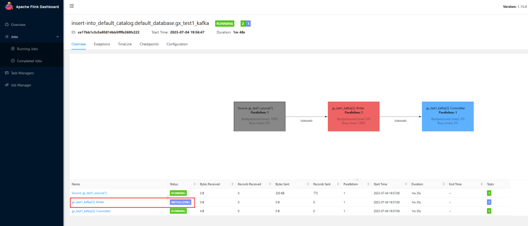 参数时也就是不设置事务前缀(默认值kafka-sink)的问题:有一个任务一直处于INITIALIZING,很长时间(现在测试的是卡住8分钟左右,之前测试的是卡住一个半小时左右,不知道什么原因导致时间减少了)之后才会变为running,导致任务卡住很长时间。