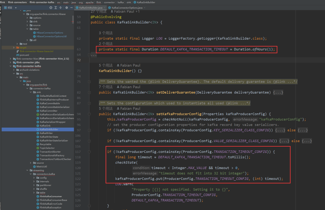 原因是因为flink kafka connector sink kafka时将事务默认的超时时间(transaction.timeout.ms)设置为一小时,超过了kafka默认的最大超时时间(transaction.max.timeout.ms)15分钟,解决方法有两个,一个是在建表语句中将transaction.timeout.ms设置小一点,比如设置为15分钟