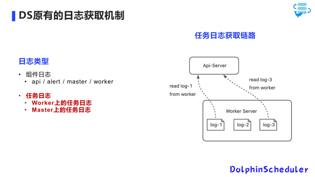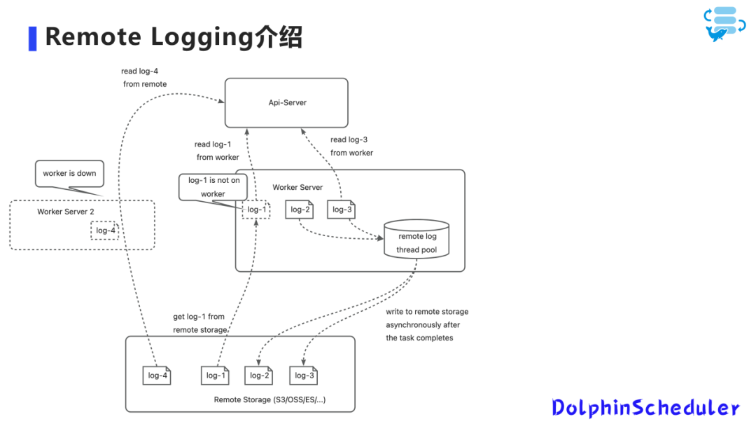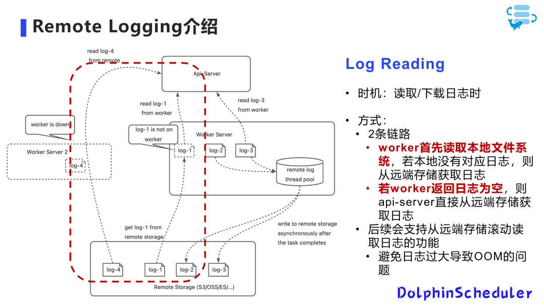 第二部分是日志读取,也就是如何从远程日志中读取日志。当用户在前端界面上下载或浏览任务日志时,API服务器会请求worker提供日志。如果涉及到远程日志,可能会有两条路径。