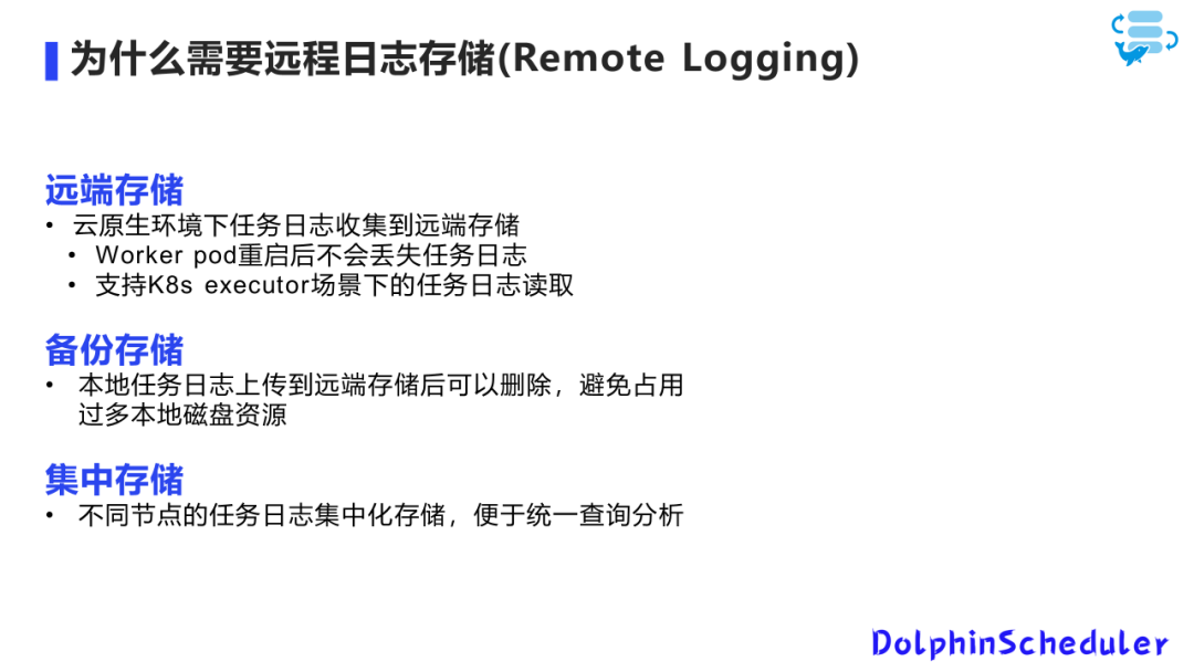 那么我们为什么需要远程日志存储呢?首先,在一些特定场景,尤其是云原生场景下,我们可能需要将任务日志存储在远端。例如,在K8s环境下,如果没有挂载持久卷,worker pod重启后任务日志就会丢失。通过远程日志存储,我们可以将任务日志发送到远端存储,从而避免这个问题。