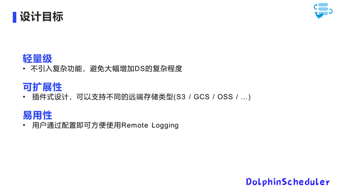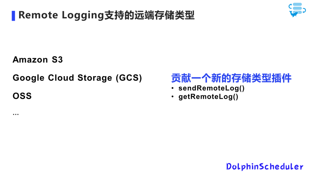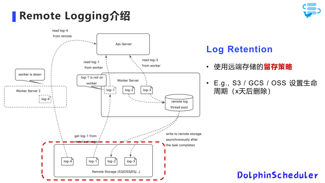 第三部分,我们要讨论的是任务日志的留存机制。我们之前提到过,我们的设计目标是保持轻量级,所以我们选择利用远端存储本身的日志留存机制,而没有将日志留存机制集成到Apache DolphinScheduler中。