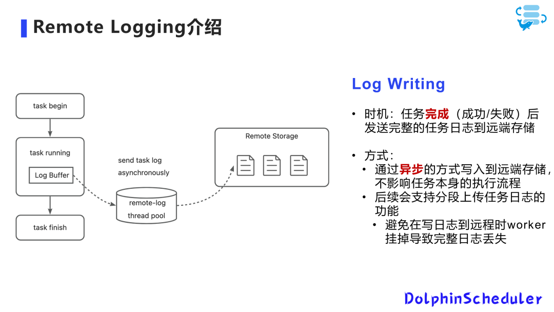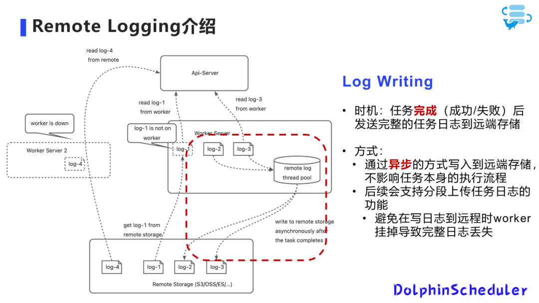 最后,远程日志存储提供了集中式存储,所有worker上的任务日志都可以发送到远程存储,进行统一查询和分析。