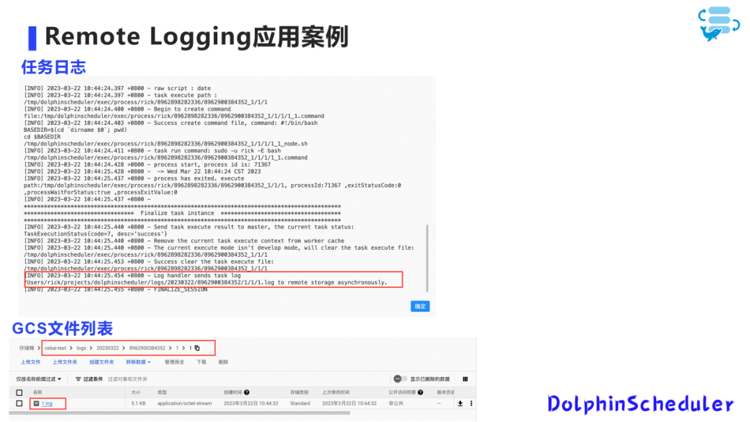 可以看出,用户只需要进行简单的配置,就能使用远程日志功能。在Apache DolphinScheduler的界面上,如果你开启了远程日志功能,你会看到一条消息,表明日志已经被发送到远程存储。同时,在GCS的文件列表中,你也可以找到对应的任务日志。