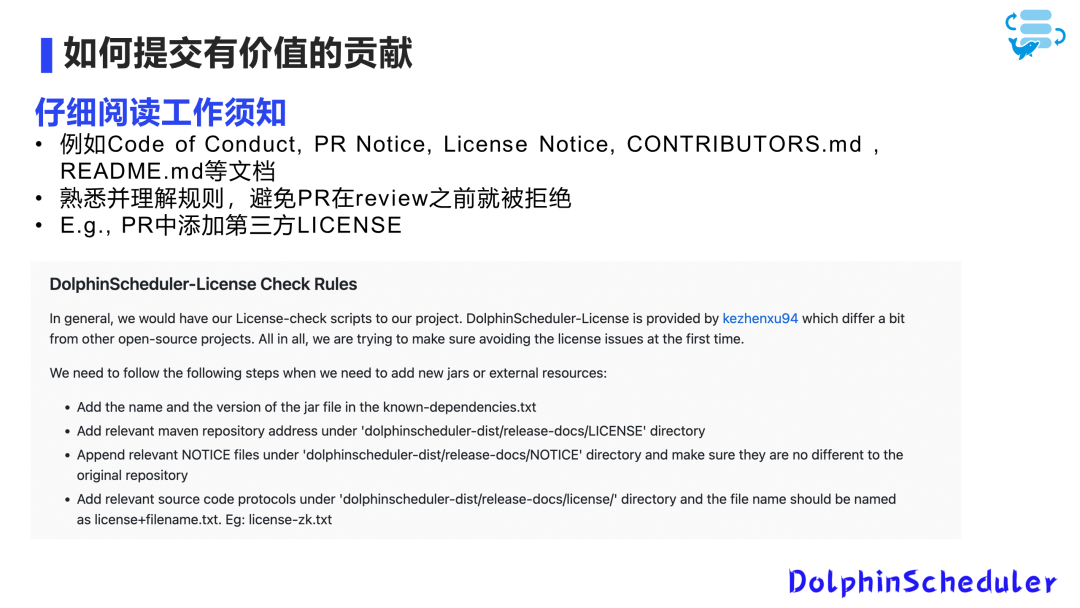 那么,如何提交一个有价值的贡献,或者说如何提交一个好的PR呢?首先,我们需要仔细阅读工作须知,这些须知可能包括一些像code of conduct,PR NOTICE,LICENSE NOTICE,README等等文档。通过这些文档,我们可以熟悉并理解社区的一些规则,避免我们的PR在review之前就被拒绝。