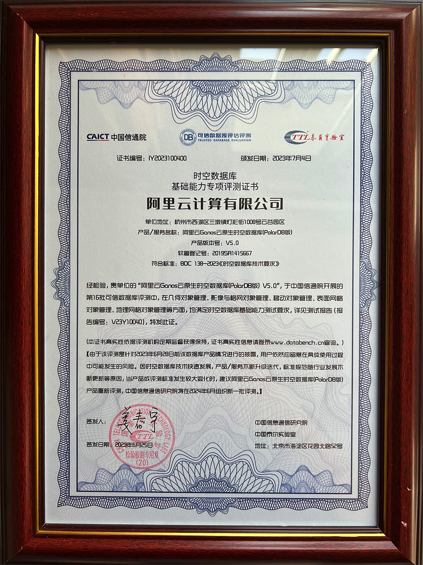 ● 云原生分布式:支持分布式事务、全局二级索引等重要特性,提供一体化体验。此外,阿里云瑶池数据库在开源领域也非常活跃,秉承拥抱、回馈的开源理念,PolarDB在2022年就全面开源了两款重磅产品:PolarDB分布式版和PolarDB for PostgreSQL版,让云原生数据库的创新技术与开源时代发展深度融合,不断回馈开源社区,为行业提供更多的云原生数据库解决方案。会上,中国信通院重磅发布了2023年上半年“可信数据库”系列评测结果。经过严苛的测试和评审,瑶池旗下的云原生数据库PolarDB同时通过了信通院时空数据库产品评测和全密态数据库基础能力测评,荣获《时空数据库基础能力专项评测证书》和《全密态数据库基础能力专项评测证书》。云原生数据仓库AnalyticDB荣获《分布式分析型数据库性能大规模专项评测证书》,代表了业界权威机构对瑶池数据库产品能力的认可。阿里云时空数据库引擎Ganos结合PolarDB,荣获时空数据库基础能力专项评测证书阿里云时空数据库引擎Ganos结合PolarDB,通过信通院时空数据库产品评测,成为全网唯一一个全量通过五大能力域中全部的59个能力项测试的数据库产品。
