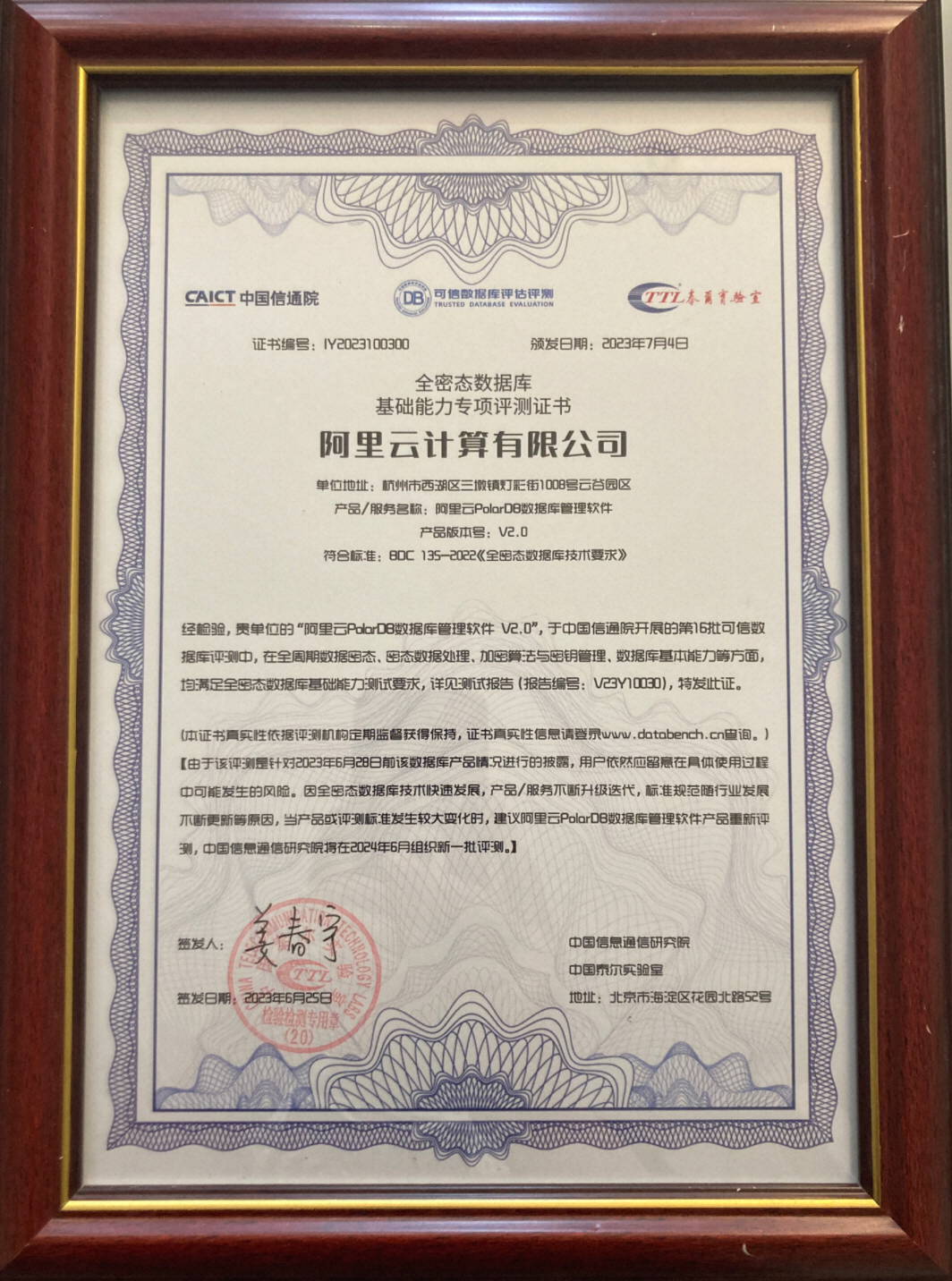 云原生数据库PolarDB荣获全密态数据库基础能力专项评测证书