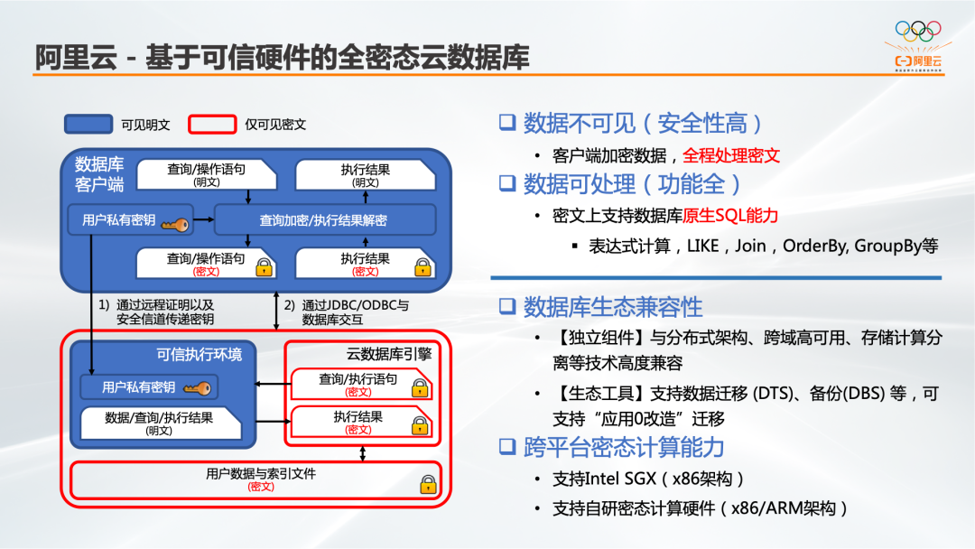 今年3月,在中国信通院组织的第一批“全密态数据库”产品能力评测中,阿里云计算有限公司(以下简称:阿里云)的云原生数据库PolarDB全密态版(以下简称:全密态PolarDB)软件成为首个顺利完成全密态数据库技术标准的全部四大能力域、三十个能力项能力测试的数据库产品。该测评依据《全密态数据库技术要求》进行,对标准中四个能力域的所有三十个能力项进行测试,涵盖了全周期数据密态、密态数据处理、加密算法与密钥管理、以及数据库基本能力等。在本周举办2023可信数据库大会上,云原生数据库PolarDB获颁《全密态数据库基础能力专项评测证书》。此次参与评测的全密态PolarDB是阿里云瑶池旗下自研的新一代云原生数据库,100%兼容MySQL和PostgreSQL,高度兼容Oracle语法,基于云原生架构、存储计算分离、软硬件一体化设计,多主多写、多活容灾、HTAP,Serverlesss 高弹性,高压缩多级冷热分层存储,DB for AI、交易和分析性能最高分别是开源数据库的6倍和400倍,TCO低于自建数据库50%,为用户提供具备极致弹性、超高性能、海量数据、高可用、高性价比的数据库服务。同时,在达摩院数据库与存储实验室加持下,融合密态计算能力构建了数据传输、数据处理、数据存储的全链路安全防护,数据在用户侧加密后传入数据库管理系统,数据明文对于数据库服务端不可见,实现了端到端的数据强安全性。