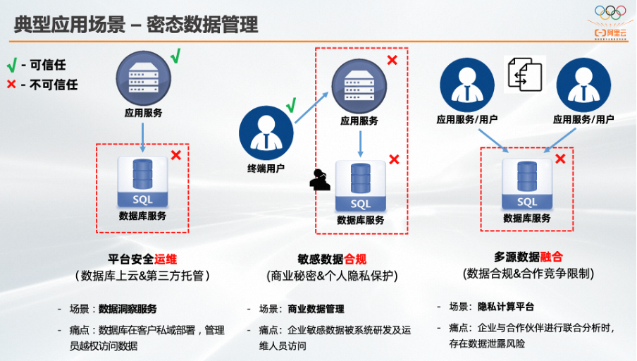 本次测试验证了全密态PolarDB数据库的全周期数据密态、密态数据处理、加密算法与密钥管理、以及数据库基本能力,证明了全密态数据库在在保障数据安全方面的卓越价值。全密态PolarDB数据库针对用户数据泄露问题,融合了密态计算能力(如TEE可信执行环境、PPE属性保持加密等),使得数据在用户侧(客户端)加密后,在服务器端全程只需要以密文形式存在,但是仍然支持所有的数据库事务、查询、分析等操作,避免云平台软件(如OS、VMM、特权系统管理工具等)、管理人员(如数据库管理员DBA、运维人员、平台人员)接触到明文数据,做到了云数据库内数据的“可用不可见”。同时,全密态PolarDB数据库兼容现有的安装适配及兼容能力、易用性能力,对应用透明,极大降低了用户使用门槛和业务切换的难度,结合阿里云强大的安全防护体系,该产品能够有效防御来自云平台外部和内部的安全威胁,时刻保护用户数据,让云上数据成为用户的私有资产。相较于传统数据库针对数据所处阶段来制定安全保护措施的,如在数据传输阶段使用安全传输协议 SSL/TLS,在数据持久化存储阶段使用透明存储加密,在返回结果阶段使 用 RLS(Row Level Security)或者数据脱敏策略。全密态数据库使得用户(在客户端)自行加密后的敏感 数据在任何时刻都不以明文形式暴露给服务器,但数据库服务仍然可以在密文数据上支持所有的计算查询、事务等操作,因此全密态数据库具备更强的数据安全防护能力,并且在研发、功能、性能等方面均具备明显优势:● 研发:应用接入仅需要少量改造,甚至零改造,投入成本低;● 功能:基于硬件提供的安全防护,任何第三方看不到数据明文,安全性有保障,并且功能上与普通数据库保持一致;此外,能够提供细粒度(加密级别)以及便捷的多密钥管理机制;● 性能:能够在密文上基于明文语义构建有效的索引,提高密文上的查询性能,应用只需要专注在业务功能逻辑,不需要耗费精力对明文和密文进行区分处理;● 更高的安全性:数据离开客户端后全程以密文形态存在,除在可信硬件环境(TEE)外始终以密文形态存在,全链路无法触及密钥和数据明文,确保了业务敏感数据在数据库端的安全;● 更全更易用的数据管理能力:管理密文数据是需要引入繁琐的应用侧逻辑,严重增加了业务研发团队的工程复杂度,如需要对涉及密文计算的SQL进行改写、当明文数据为数值等非文本类型时需要作数据类型的转换、不同数据列对应的密钥需要手动管理等;因此全密态数据库闭环了密态数据处理能力抽象出通用接口给上层业务,大大降低了研发成本;● 更方便的运维支持:由于业务本身的敏感性,更好的保证敏感数据安全性避免接触线上明文数据,因此给运维在线上故障排查带来了难题,而全密态数据库让运维操作密文无感知。全密态数据库通过将复杂加密操作封装在客户端 SQL 驱动内部,实现完全自动化的敏感信息加密,同时在数据库中存储了所有加密相关的元信息,数据库可以很好的识别和处理对应的加密数据。随着国家对数据安全和个人敏感信息的加强监管,原子化的数据安全能力无法满足监管要求,国标和行业标准逐渐提出数据全生命周期的安全保障的需求,传统的三方安全加固和客户端加密都在客户成本、架构改造、数据库性能等带来了不同层面的弊端,因此全密态数据库得到了快速发展和行业认可。从应用视角看,全密态数据库可以解决不同应用场景下的数据安全问题,几种典型场景如下图所示: